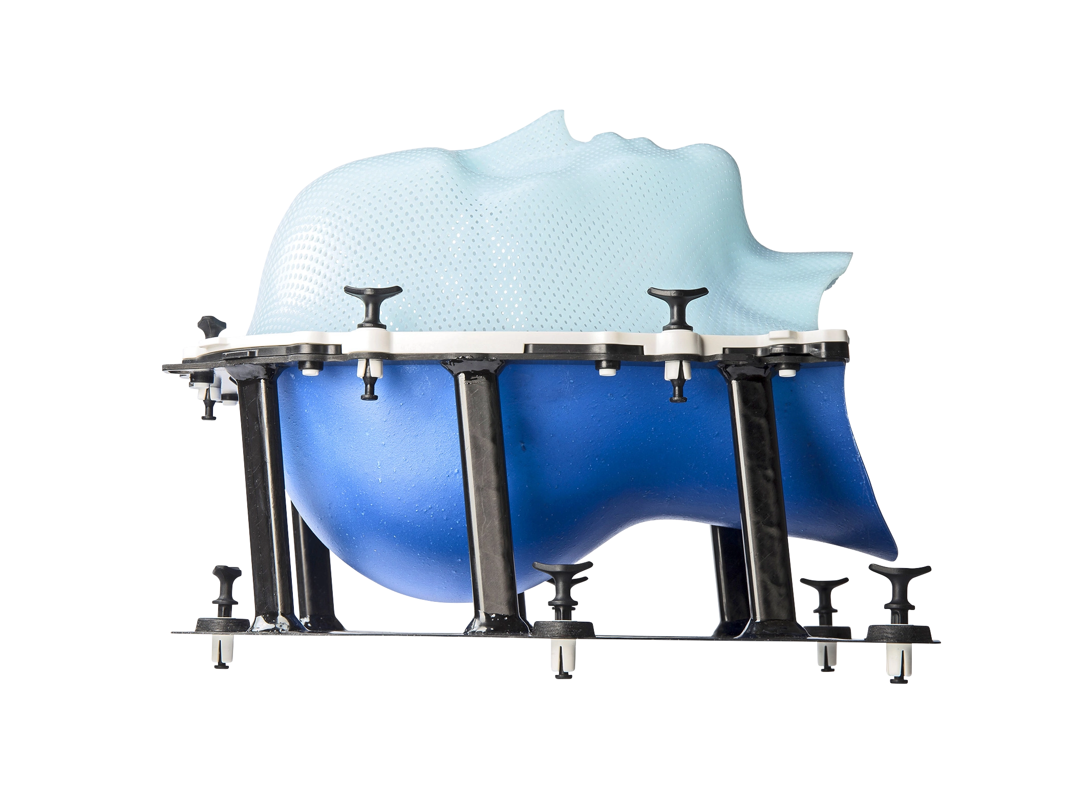 When using the DSPS® for SRS/SRT, the system consists of a “double shell” of two masks made of special thermoplastic materials formulated specifically for use with the cradle. The patented material of the occipitalmask is rigid enough to hold the patient’s head during molding, acting as a “second skin” to create a perfect mold of the occiput.